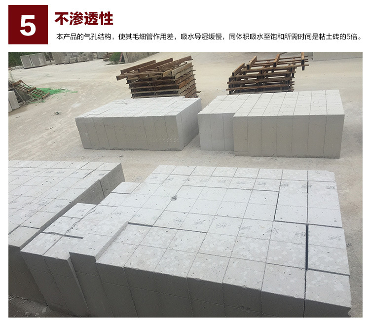 5、 不滲透性:本產(chǎn)品的氣孔結(jié)構(gòu),使其毛細(xì)管作用差,吸水導(dǎo)濕緩慢,同體積吸水至飽和所需時(shí)間是粘土磚的5倍。