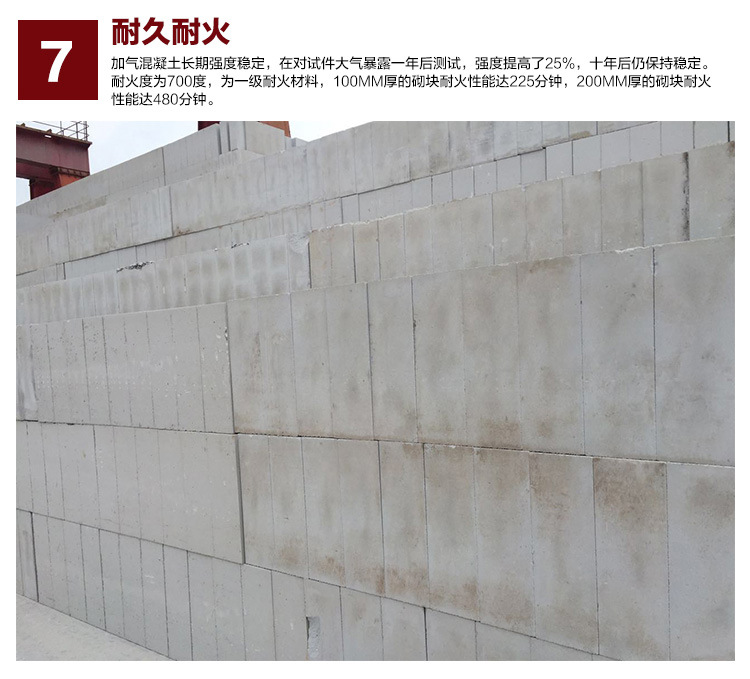 耐火:耐火度為700度,為一級耐火材料,100mm厚的砌塊耐火性能達225分鐘,200mm厚的砌塊耐火性能達480分鐘。